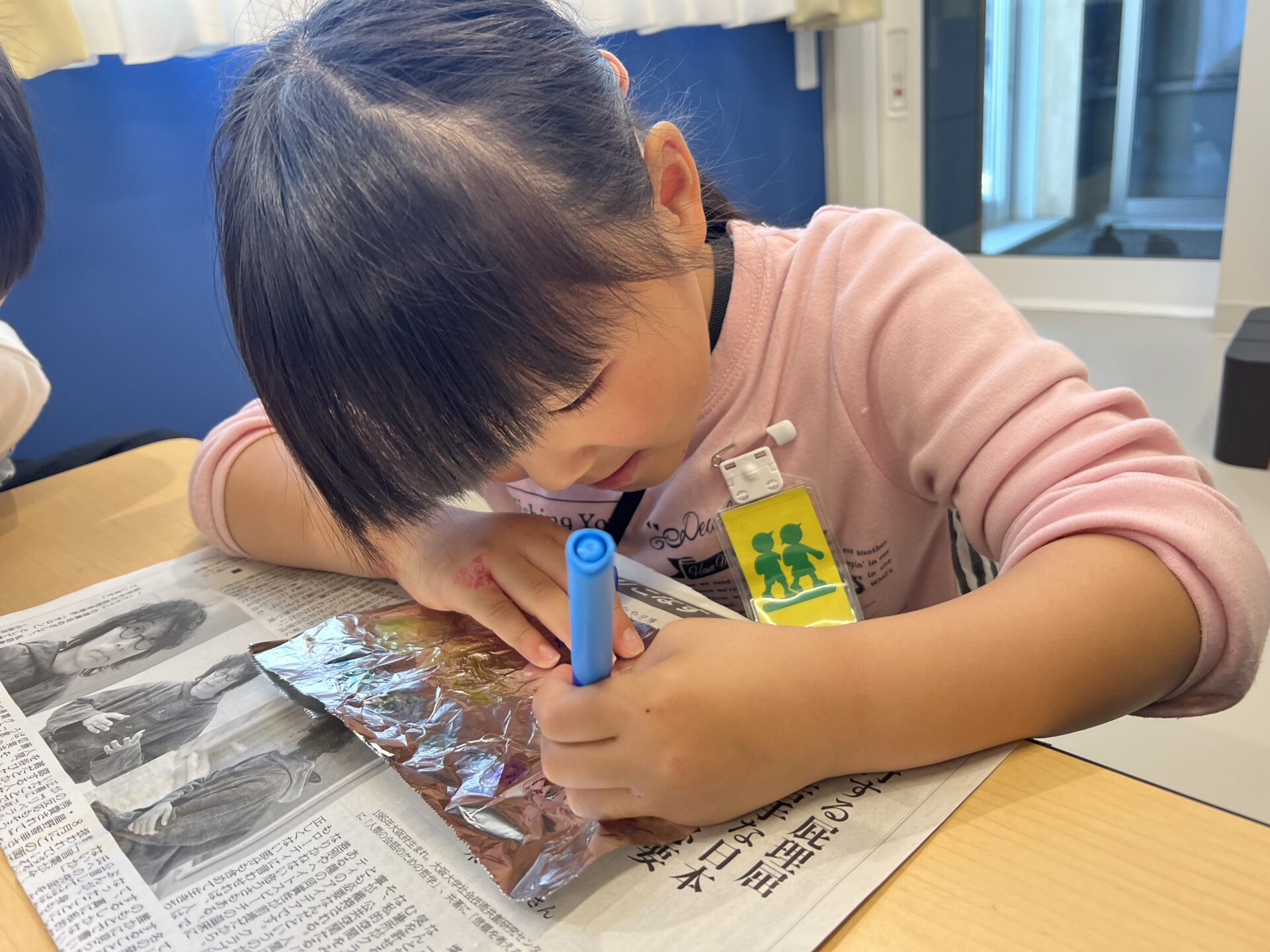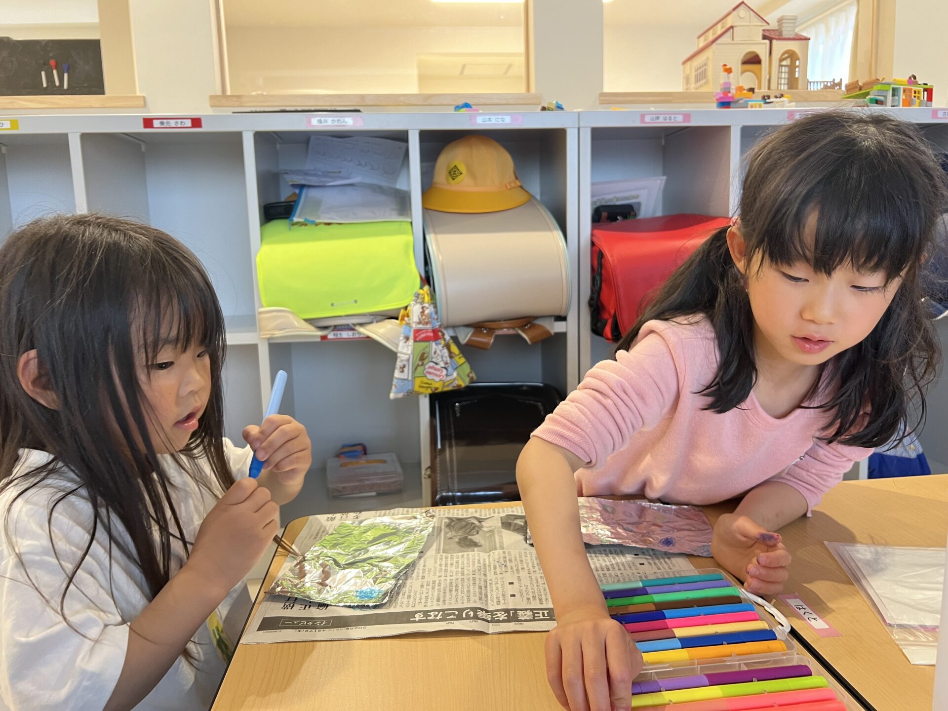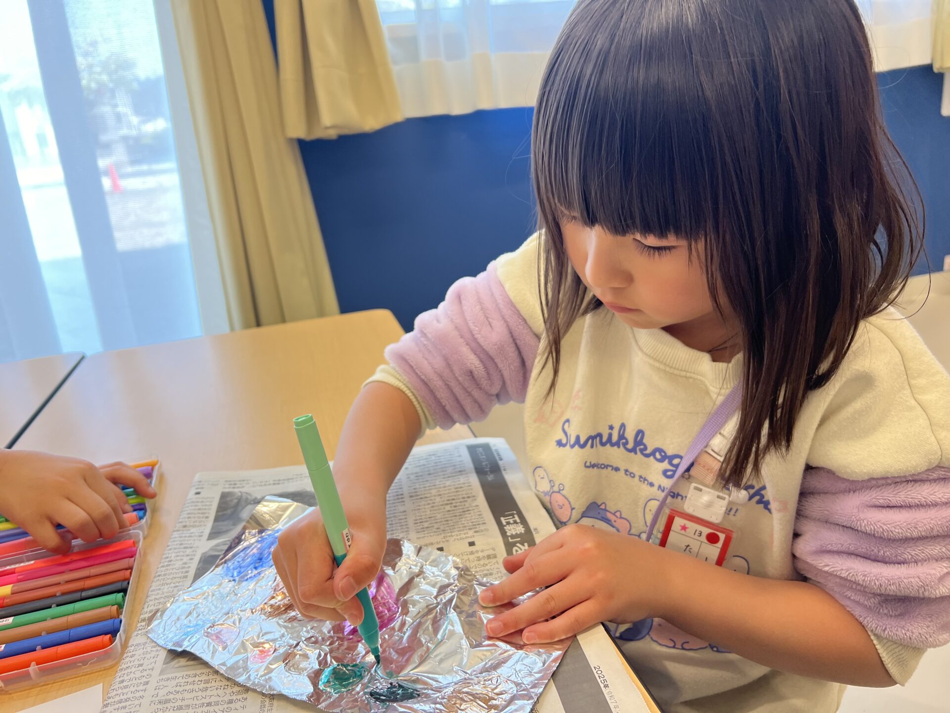 アルミホイルに水性ペンで色を塗っていき….水を吹きかけて💦!