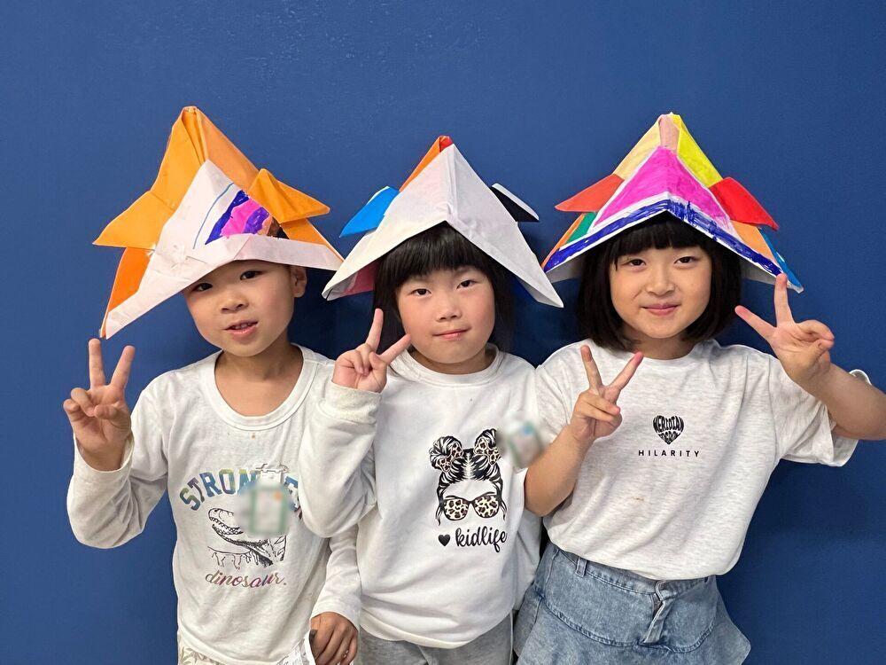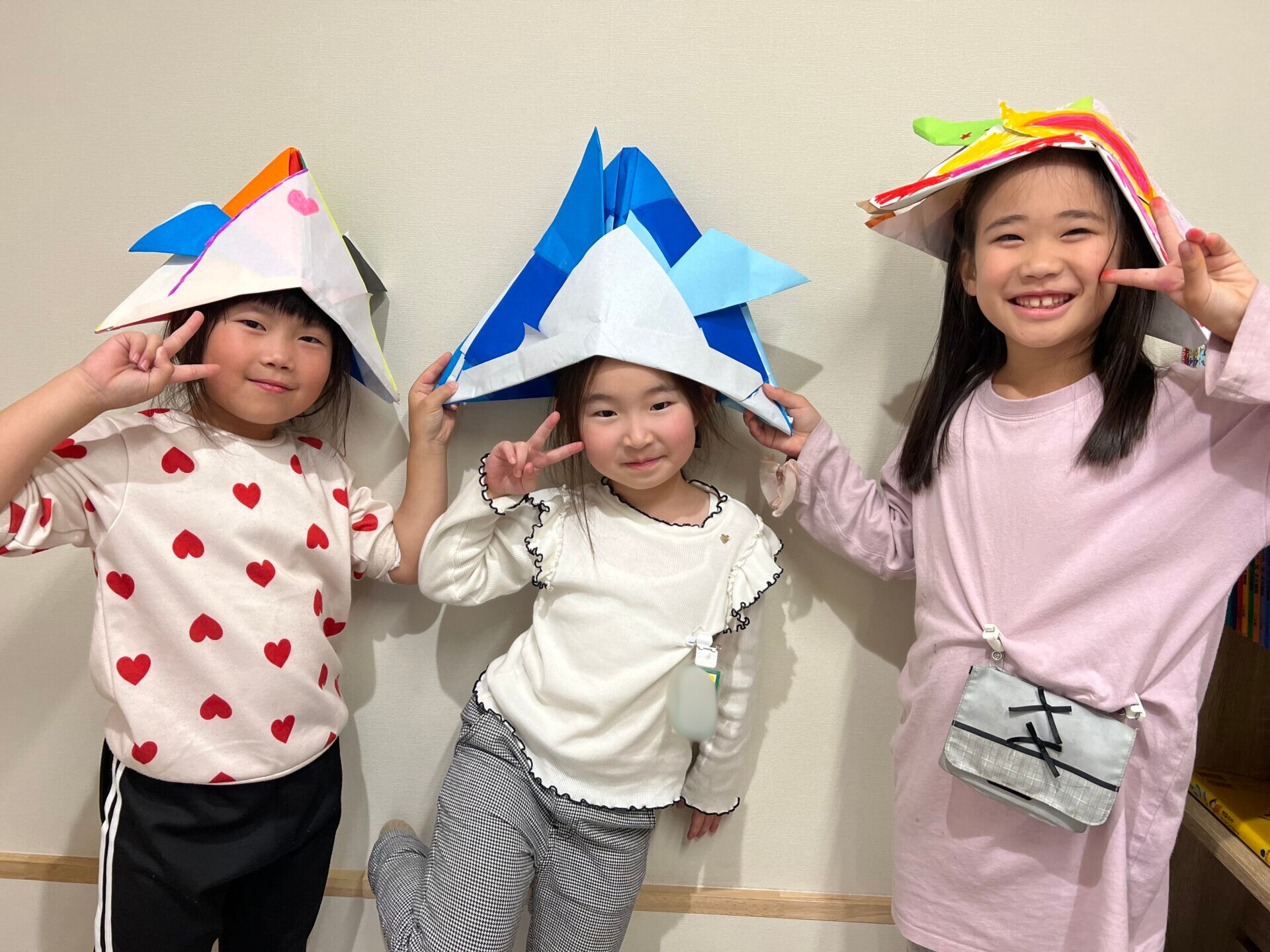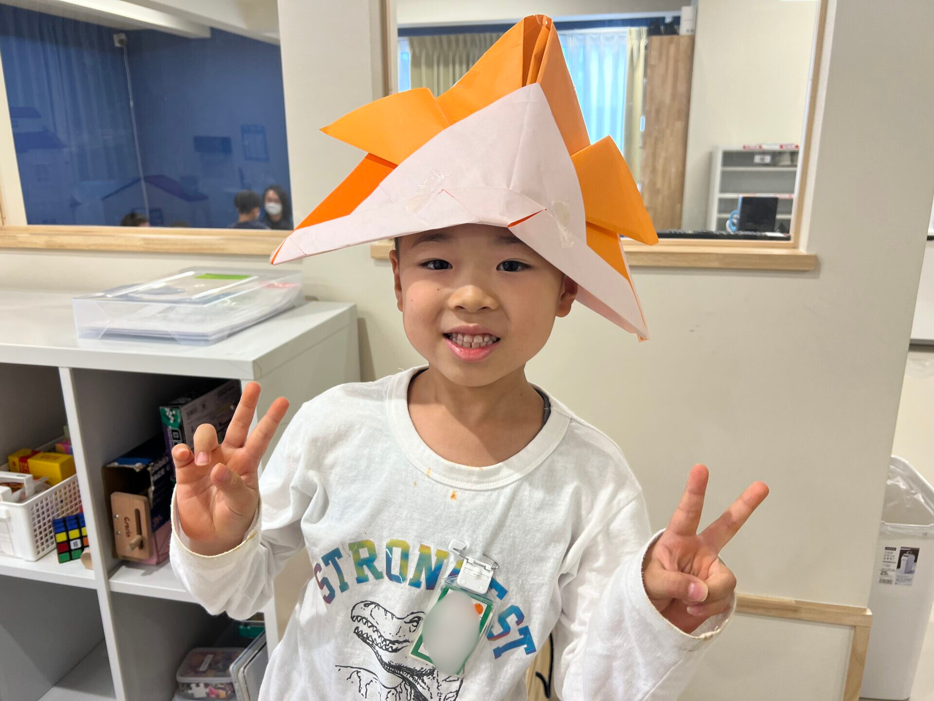 たくさんの折り紙を繋げて1枚の大きな折り紙を作り、大きな兜帽子が完成✨